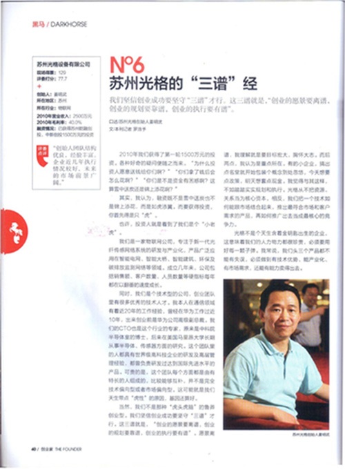 2011年8月,《創(chuàng)業(yè)家》雜志第36期報道了《黑馬十強 No6蘇州光格的“三譜”經(jīng)》的文章,文章中所指出的三譜就是,“創(chuàng)業(yè)的愿景要離譜,創(chuàng)業(yè)的規(guī)劃要靠譜,創(chuàng)業(yè)的執(zhí)行要有譜”。文章的全文如下圖所示: